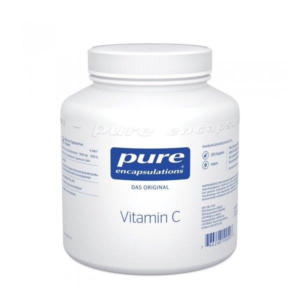 Weißer Kunststoffbehälter mit blauem Aufdruck, enthält Vitamin C in Kapselform, vegan, 250 Kapseln.
