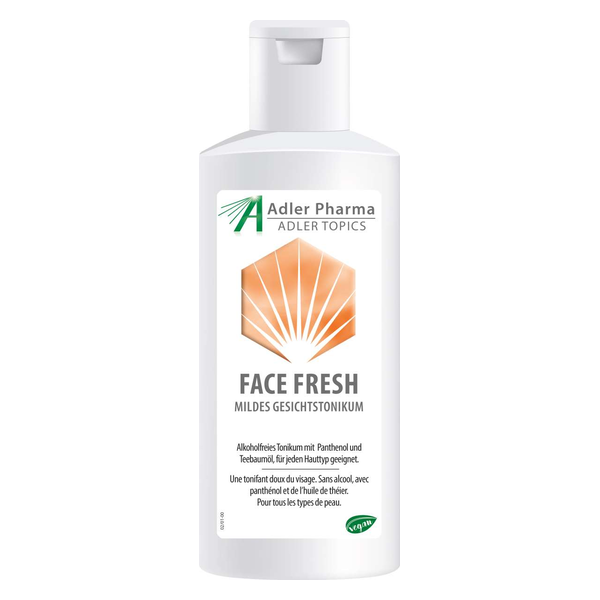 Flasche mit mildem Gesichtstonikum "Face Fresh" von Adler Pharma, alkoholfrei, mit Panthenol und Teebaumöl.