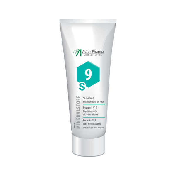 Eine Tube mit Salbe Nr. 9 zur Fettreduzierung der Haut, beschriftet mit verschiedenen Sprachen und einem hexagonalen Symbol.