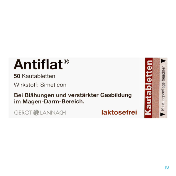 Verpackung von Antiflat Kautabletten, Wirkstoff Simeticon, zur Linderung von Blähungen, laktosefrei.