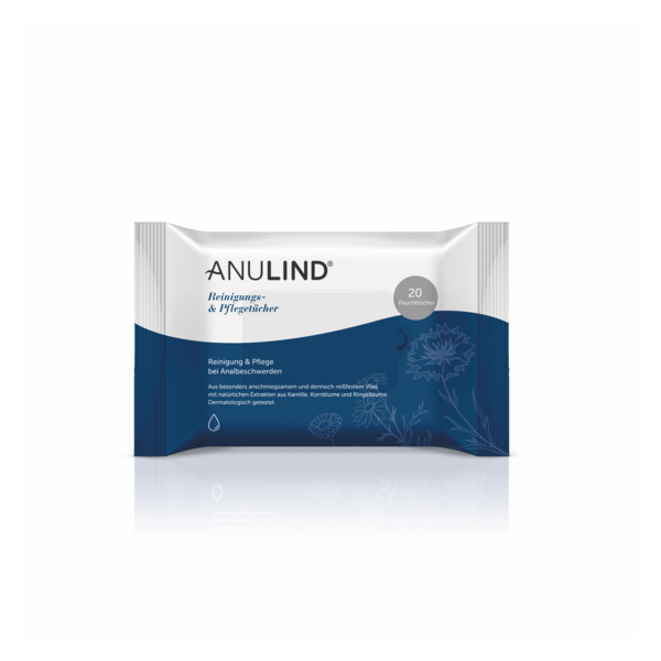 Packung mit Reinigungs- und Pflegefeuchttüchern für Analbeschwerden, dermatologisch getestet, mit Pflanzenextrakten.