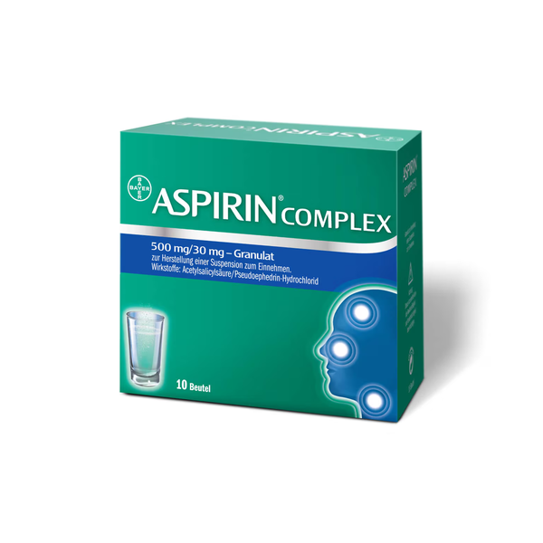 Packung von Aspirin Complex Granulat zur Herstellung einer Suspension, enthaltene Wirkstoffe sind Acetylsalicylsäure und Pseudoephedrin.