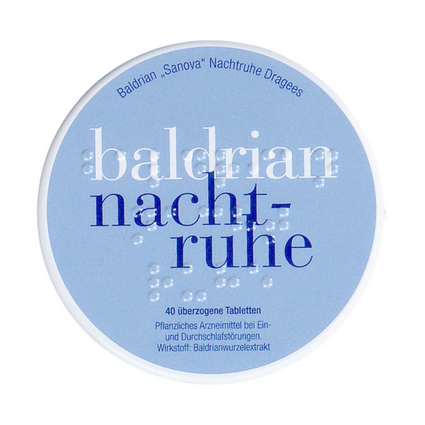Runde Dose mit blauem Deckel, enthält überzogene Baldrian-Tabletten zur Unterstützung bei Schlafstörungen.