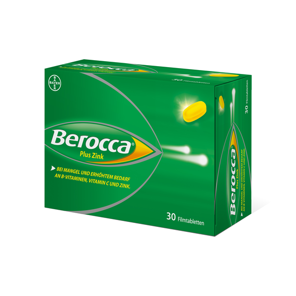 Verpackung von Berocca Plus Zink mit 30 Filmtabletten in grüner Schachtel, betont Vitamin B, C und Zink.