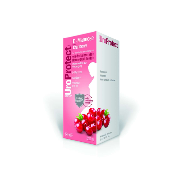 Packaging von UroProtect D-Mannose Cranberry zur Vorbeugung von Harnwegsinfekten, mit Markenzeichen und Zutatenangaben.
