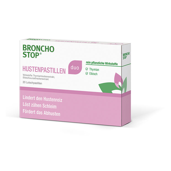 Verpackung von Broncho Stop Hustenpastillen mit pflanzlichen Wirkstoffen, inklusive Thymian und Eibisch.