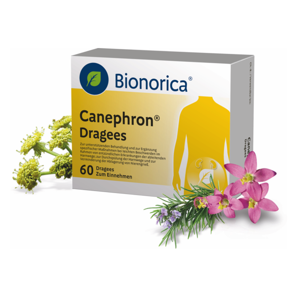 Packung Bionorica Canephron Dragees zur Unterstützung der Nierenfunktion, umgeben von Kräutern und Blumen.