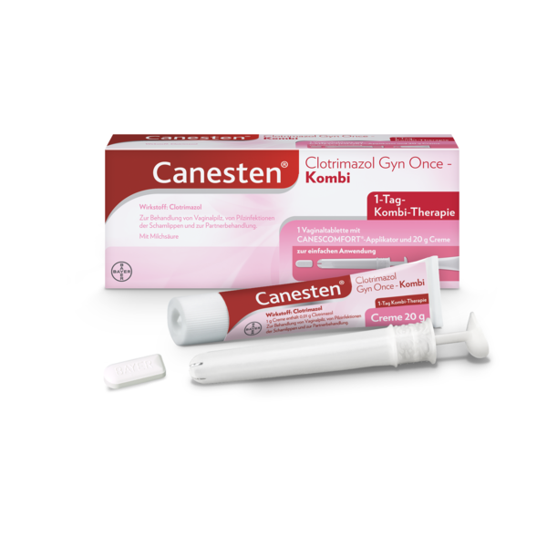 Packung von Canesten Clotrimazol Gyn Once Kombi, enthält Creme und Vaginaltablette zur Behandlung von Pilzinfektionen.