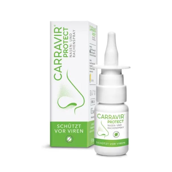 Flasche mit Carravir Protect Nasen- und Rachenspray in weiß mit grünen Akzenten, verpackt in einer umweltfreundlichen Box.
