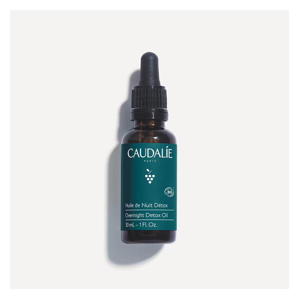 Braune Glasflasche mit Pipette, enthält ein Gesichtsöl von Caudalie, mit grüner Etikettierung und Bio-Siegel.