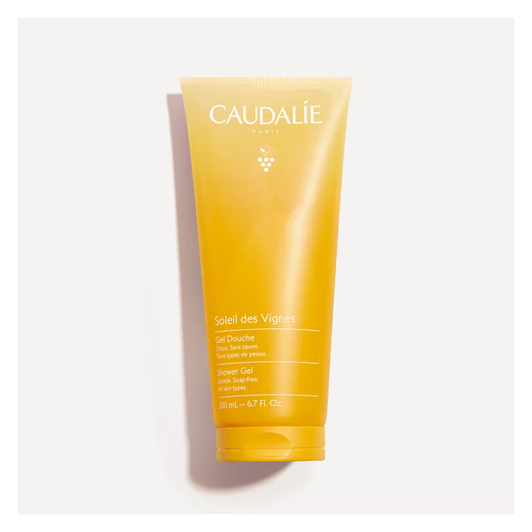 Eine gelbe Tube mit dem Duft von Soleil des Vignes, die ein sanftes Duschgel für alle Hauttypen enthält.