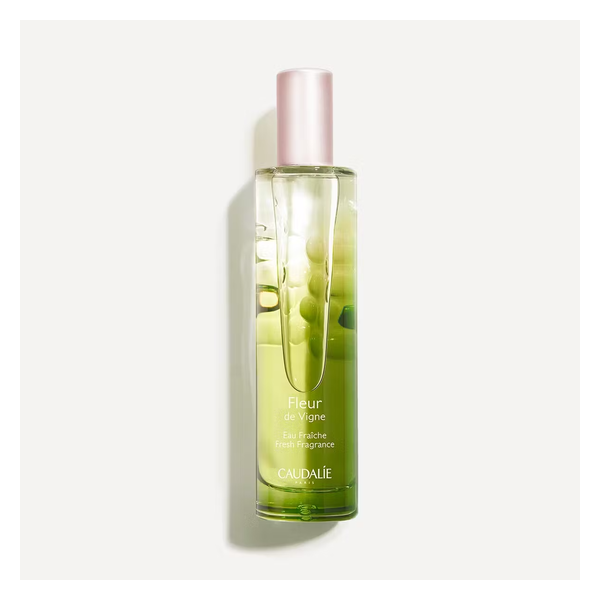 Flasche mit grünem Duftwasser "Fleur de Vigne" von Caudalie, schmal mit rosa Kappe.