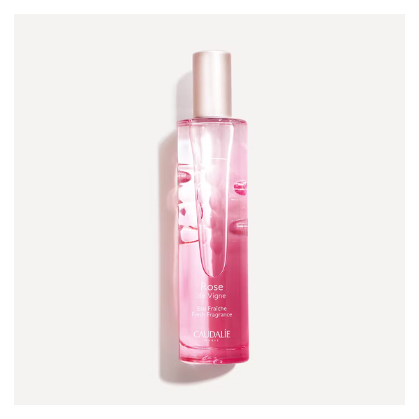 Flasche mit brauner Flüssigkeit, oben mit einem glatten, hellen Deckel, beschriftet mit "Eau Fraîche" und "Caudalie".