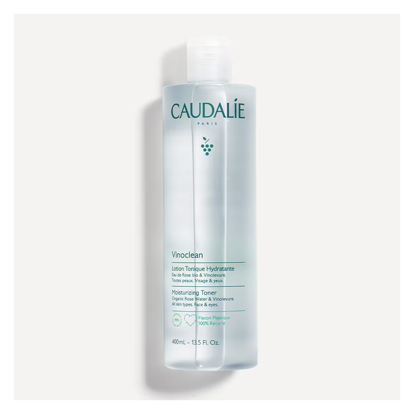 Flasche hydratierender Gesichtswasser von Caudalie mit hellblauer Flüssigkeit und grünem Label.
