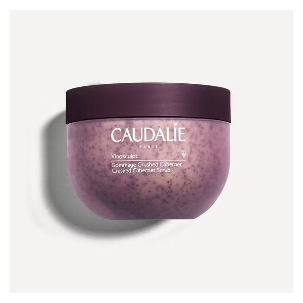 Runde, lila Verpackung des Caudalie Vinosculpt Gommage Crushed Cabernet mit einem dunklen Deckel.