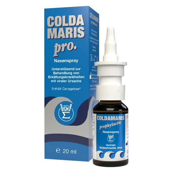 Nasen spray in braunem Glasfläschchen mit Sprühkopf, eingekapselt in einer blauen Verpackung mit weißen und grauen Akzenten.