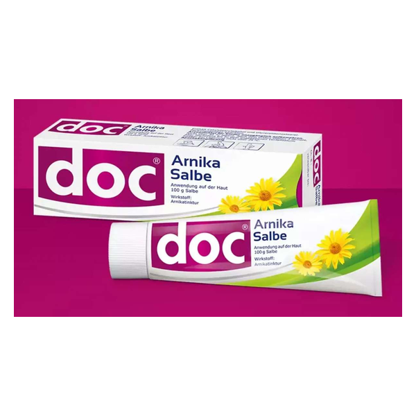 Arnika-Salbe in einer Tube mit gelben Blüten auf dem Etikett, verpackt in einer Kartonage mit lila Schriftzug.