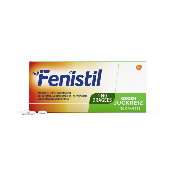 Packung Fenistil Dragees mit 1 mg Dimetindenmaleat gegen Juckreiz, enthält 30 Stück.