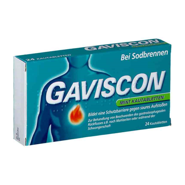 Gaviscon Mint Kautabletten Verpackung mit Hinweisen zur Verwendung bei Sodbrennen und Schutzbarriere gegen Aufstoßen.