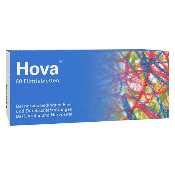 Packung Hova mit 60 Filmtabletten für nervöse Schlafstörungen und Unruhe, bunte grafische Gestaltung.
