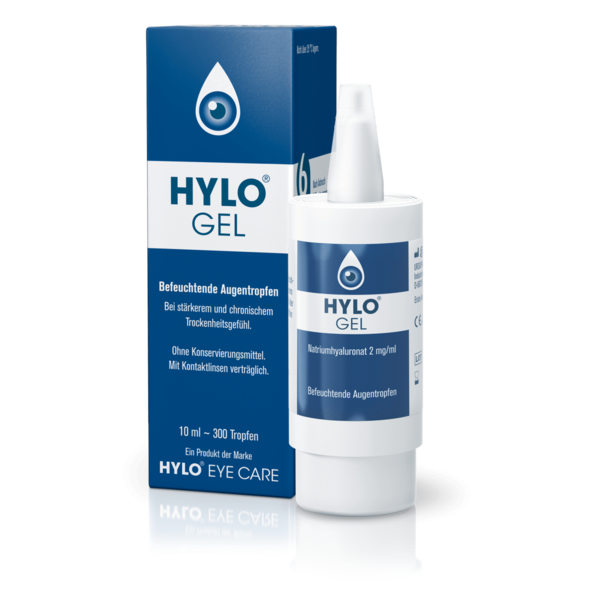 Flasche mit befeuchtenden Augentropfen in einer Verpackung, hervorgehoben die Marke HYLO und deren Eigenschaften.