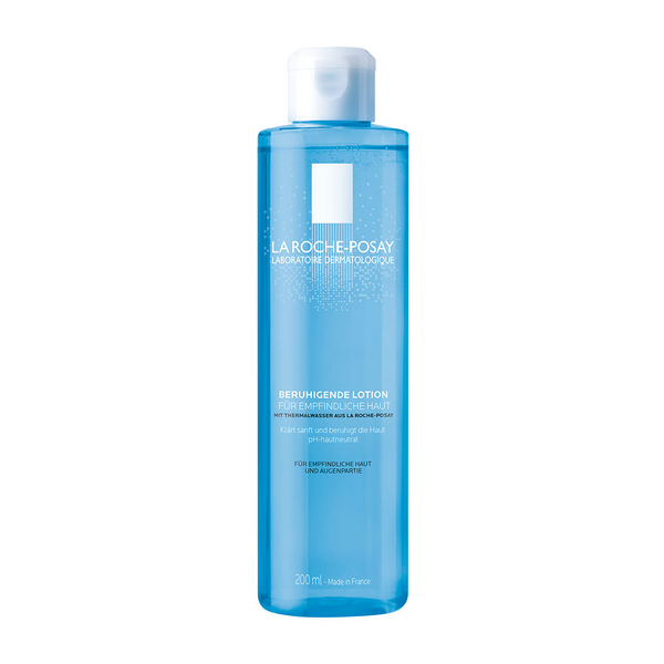 Transparente Flasche mit beruhigender Lotion für empfindliche Haut, hergestellt mit Thermalwasser, 200 ml.