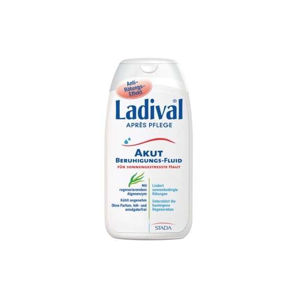 Flasche Ladival Après Pflege mit akut beruhigendem Fluid für sonnenbeanspruchte Haut und Anti-Rötungs-Effekt.