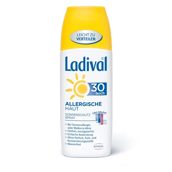 Flasche mit Ladival Sonnencreme Spray für allergische Haut, Lichtschutzfaktor 30, gelbe Kappe, fettfrei und wasserfest.