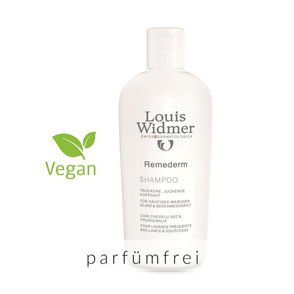 Flasche mit Remederm Shampoo von Louis Widmer, vegan und parfümfrei, für trockene, juckende Kopfhaut.