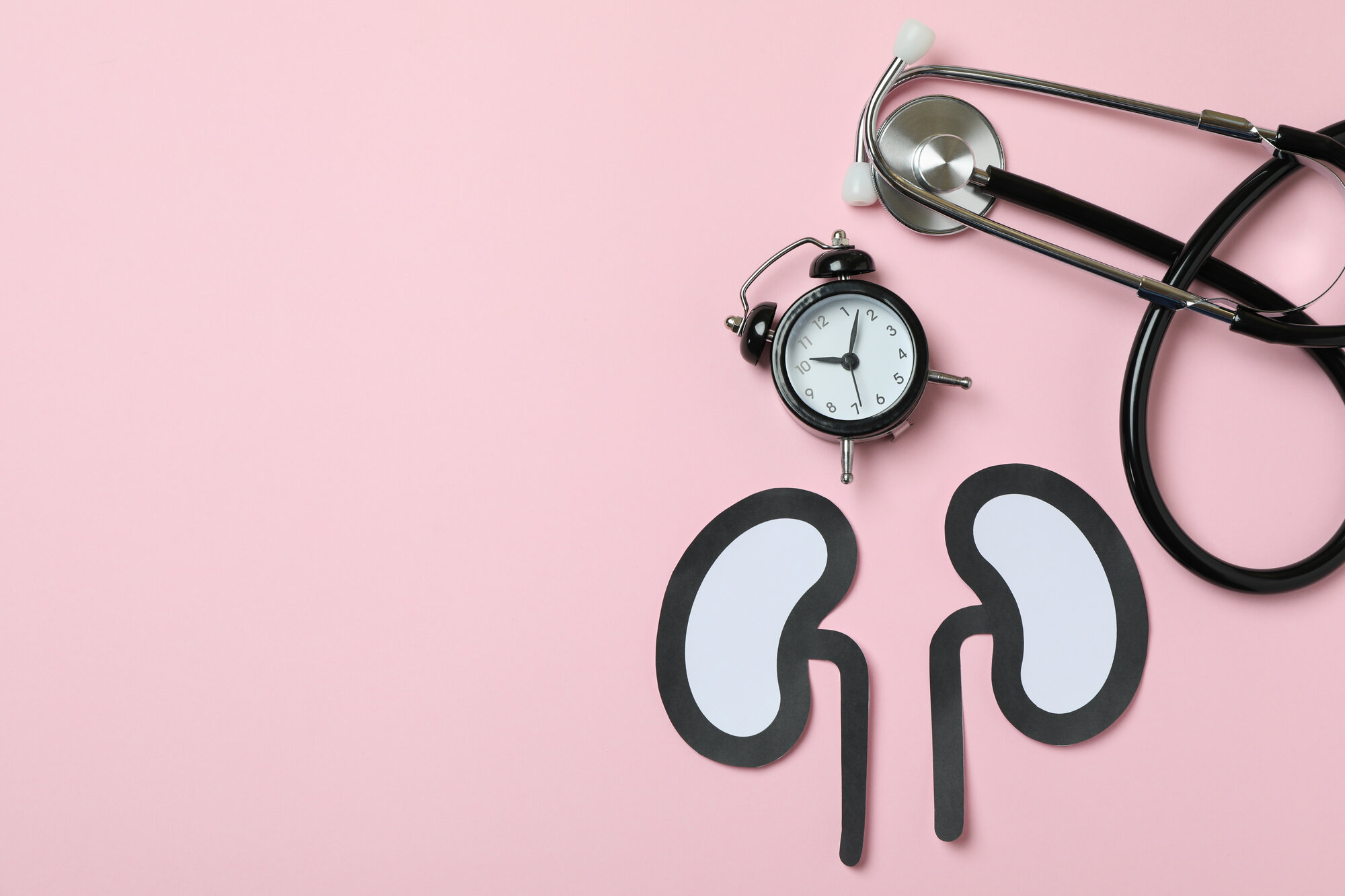 Papierfiguren von Nieren auf einem rosa Hintergrund, daneben eine Armbanduhr und ein Stethoskop.