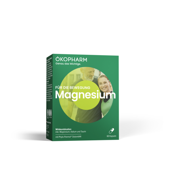 Verpackung einer Magnesiumpräparat mit grüner und blauer Farbgestaltung, zeigt aktive Menschen im Hintergrund.
