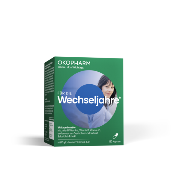 Verpackung eines Nahrungsergänzungsmittels für die Wechseljahre mit einer abgebildeten Frau und Inhaltsstoffen auf der Box.