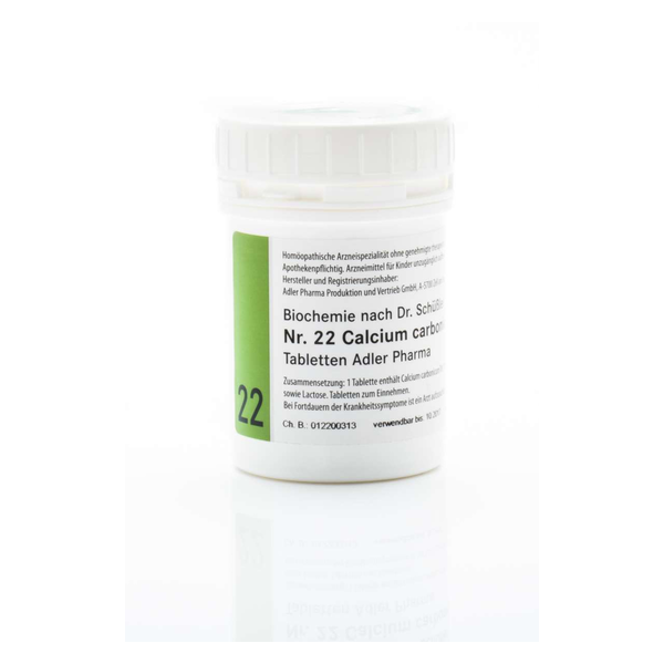 Weißer Tablettenbehälter mit grünem Etikett, der homöopathische Calciumcarbonat-Tabletten enthält.