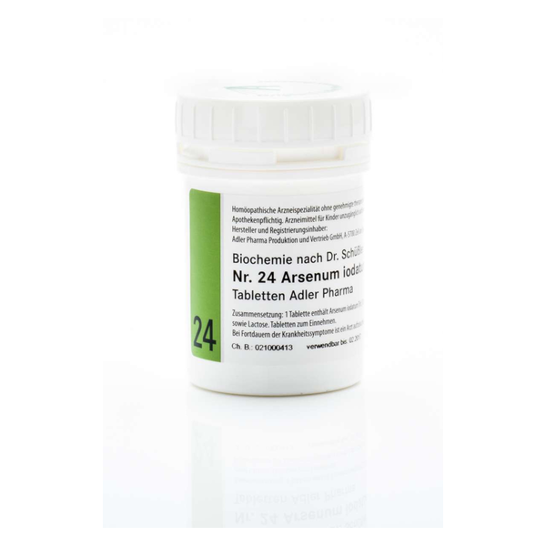Weißer, runder Arzneimittelbehälter mit grünem Etikett, beschriftet mit "Nr. 24 Arsenum iodatum" und Hinweisen zur Anwendung.