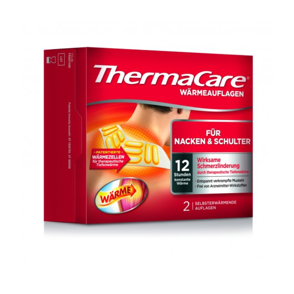 Verpackung von ThermaCare Wärmeauflagen für Nacken und Schulter, betont Wirkung und Anwendung.